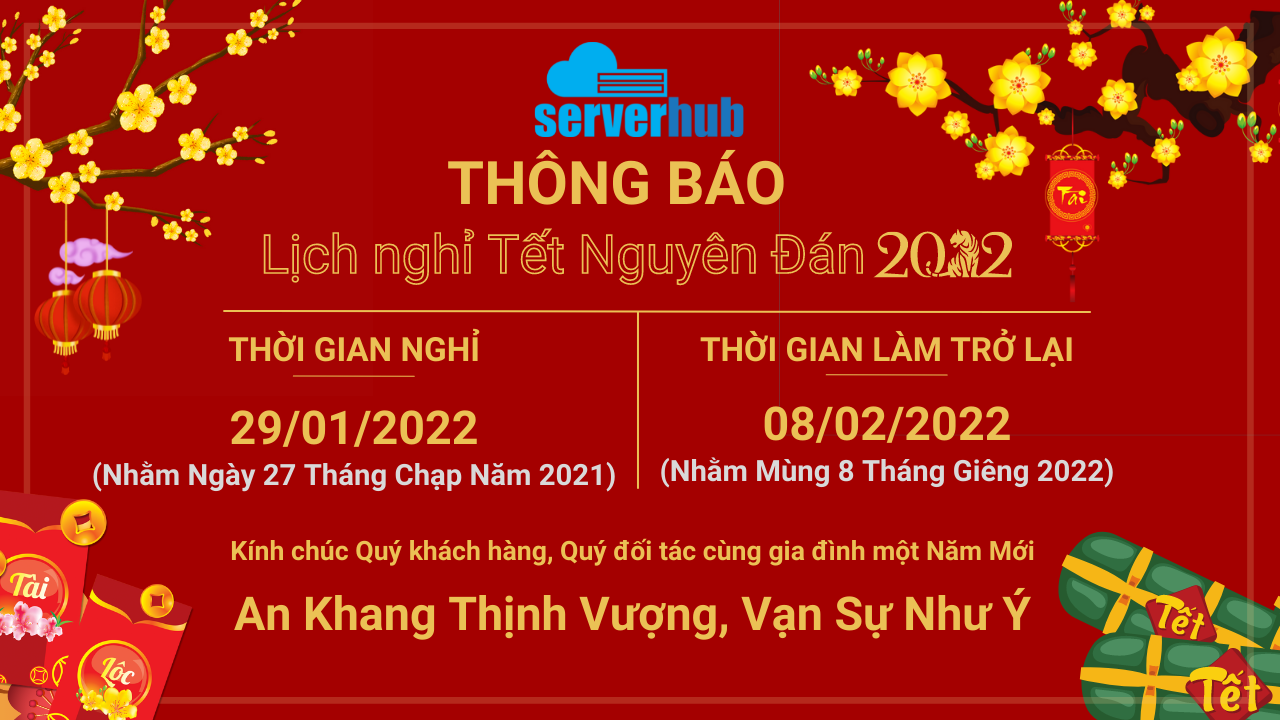 Hôm nay, Công ty cổ phần SERVERHUB xin trân trọng thông báo tới Quý khách hàng, Quý đối tác lịch nghỉ Tết Nguyên Đán 2022 như sau: